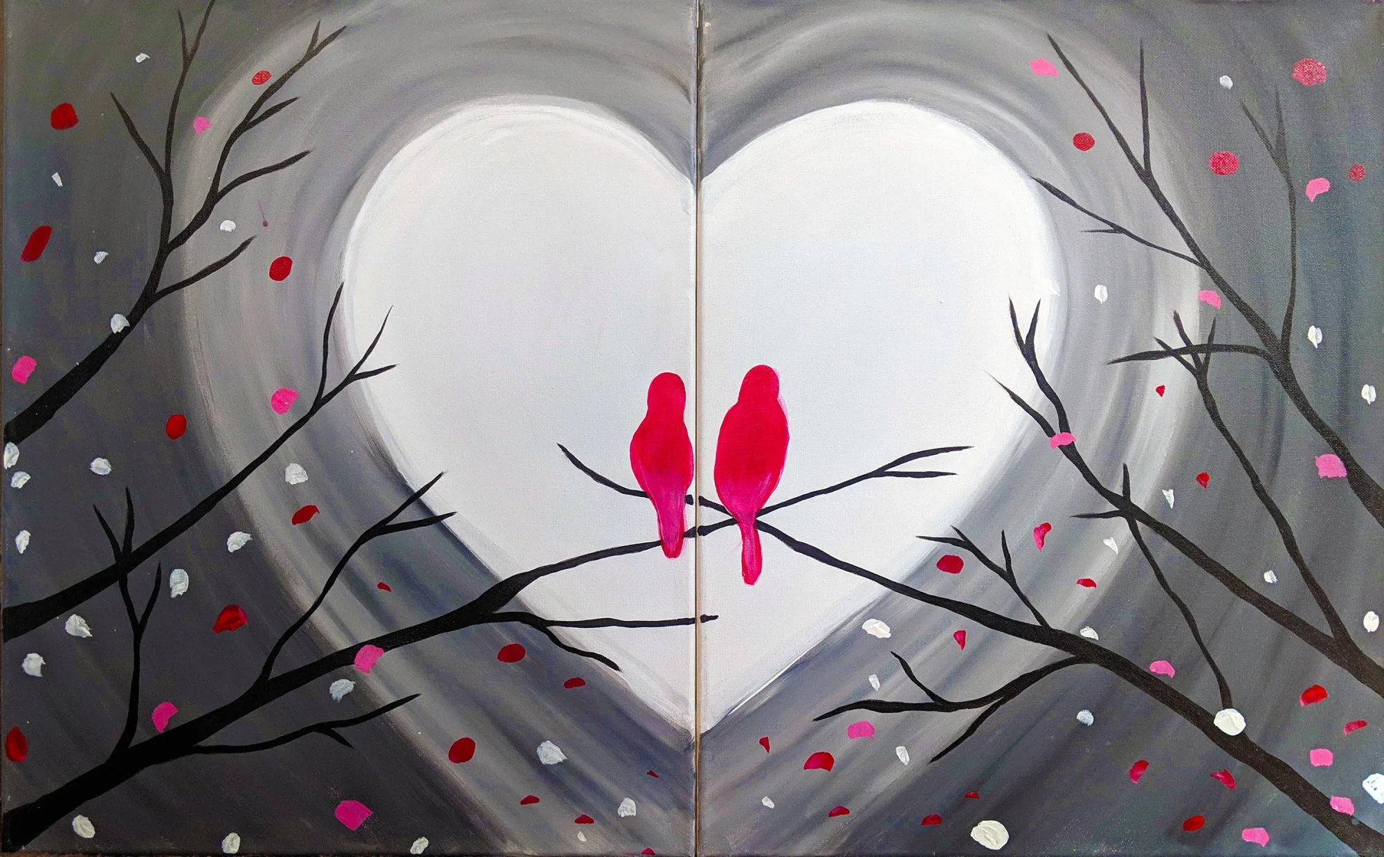 Come with a partner to paint a set of 12x16 canvases that hang together featuring a blended heart background with two love birds on intertwined branches.This class includes all supplies and instruction, and is designed for ages 16 and up. Registration fee of $55 is per couple and includes two canvases.